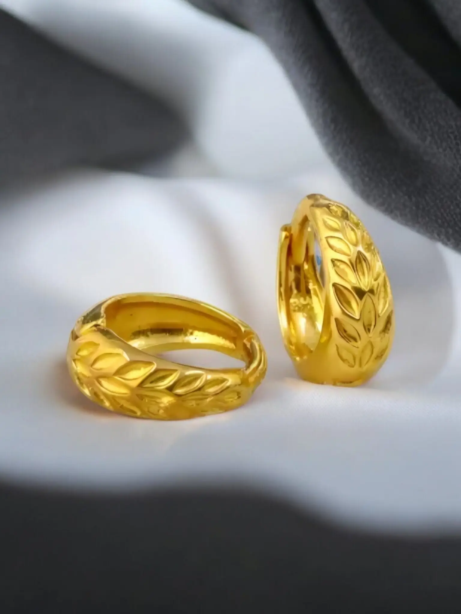 Elegant gold-plated leaf design hoop earrings for women. Perfect for daily wear or special occasions, these stylish and lightweight hoops add a classy touch to any outfit.